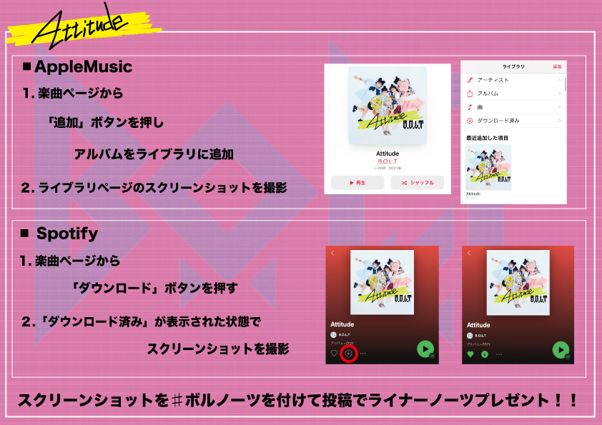 本日9月16日より9月1日配信リリースのB.O.L.T2ndALBUM「Attitude」のライブラリ追加キャンペーンがApple MusicとSpotifyにてスタートします。