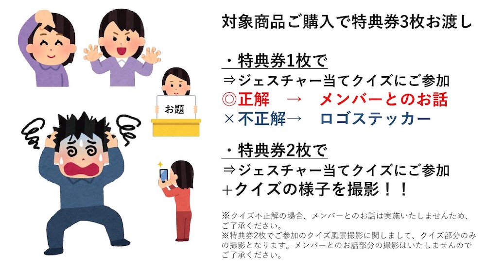 ・特典券2枚:メンバーとのジェスチャー当てクイズご参加+クイズ風景動画撮影