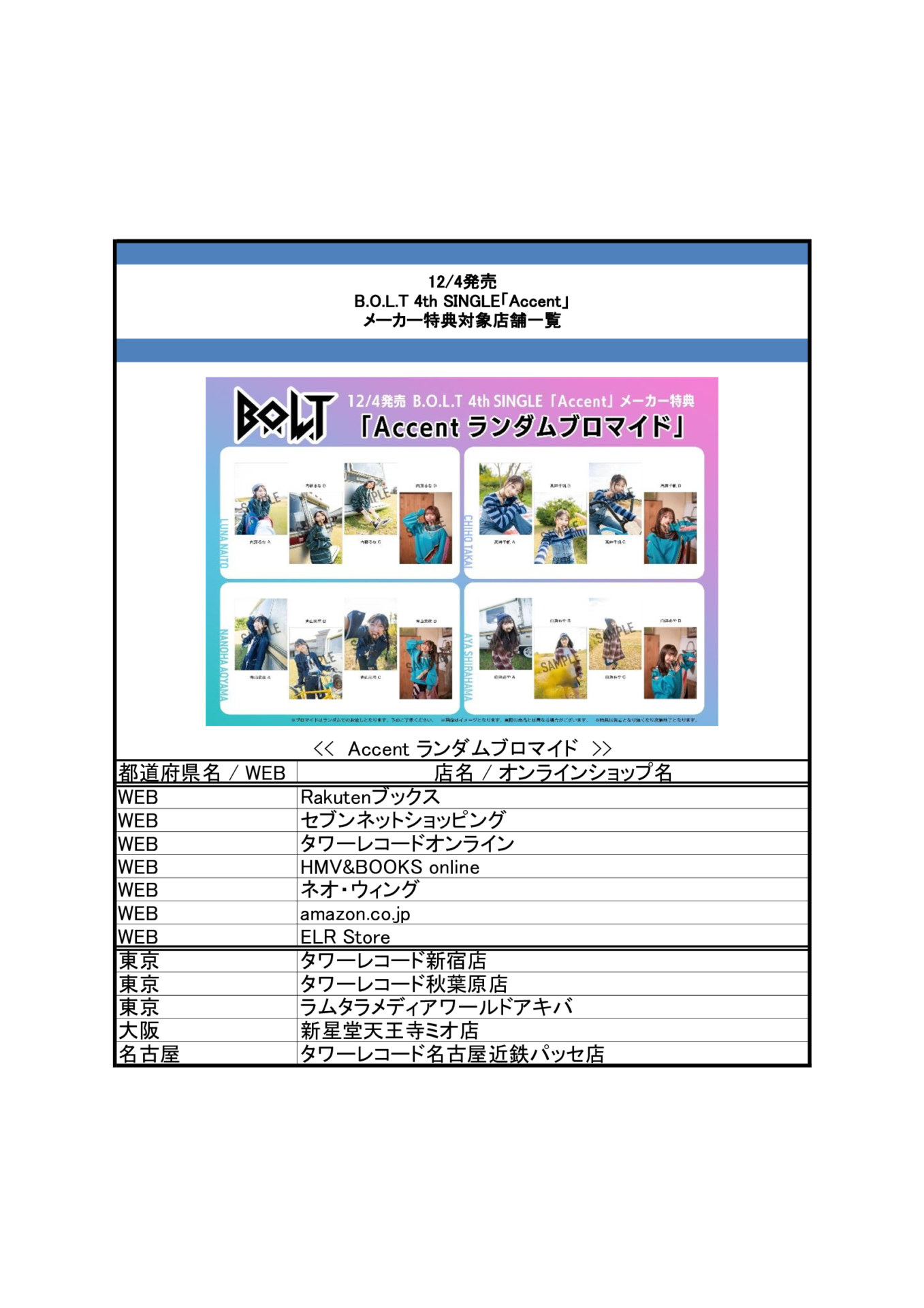 対象店舗にて12月14日(水)発売B.O.L.T4th SINGLE「Accent」をご購入いただいた方を対象にメーカー特典「Accentランダムブロマイド」をプレゼント致します!